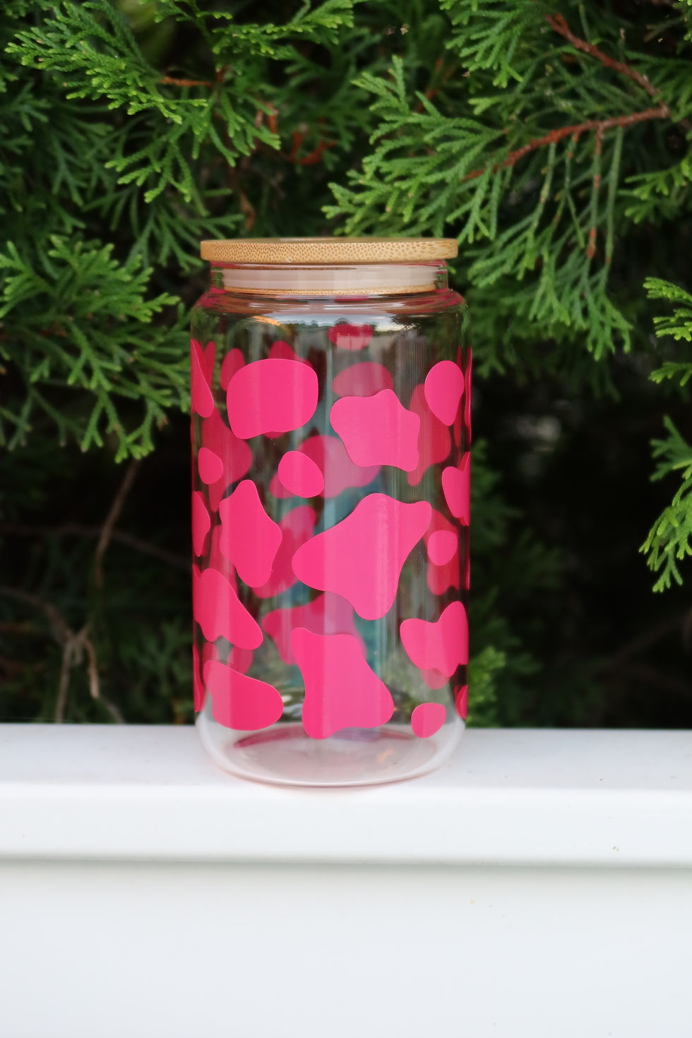 Hot Pink Cow Print Glass Cup 16oz + Straw + Lid